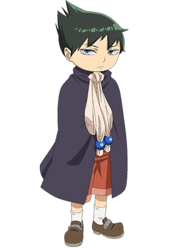 Muhyo is a young short man with a big oval head and cat like blue eyes. His sleek black hair is comically slicked up to a side.